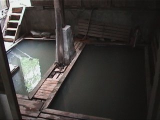温泉棟の内湯 入っていくと蛇がにょろにょろ! やっぱり暖かいところがすきらしい! 脱衣場も男女別にちゃんとあるが、中はこのように混浴だ。 ちょうどいい湯加減にここも調整され、お湯がパイプをつなぎ合わせて注がれている。 もちろん、全部が源泉100%! |