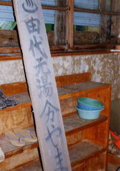 玄関からのぞくと、きっと営業していたころかかっていたであろう田代元湯の看板が置いてあった これひとつとっても貴重なものだが だれもとって行かないのは 温泉好きにとってほっとさせられること・・・ |