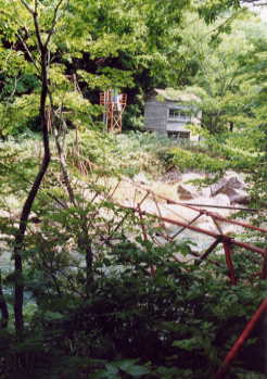 田代元湯へ通じる山道を降りきって少し行くと、赤いつり橋が見えてくる 橋を渡るともうそこは田代元湯に敷地内だ 橋の上から眺める渓流は秋にはきっとすばらしい紅葉にとけこんでいることでしょう |