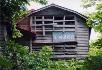 田代元湯「やまだ館」の旅館建物です 玄関や窓は板が打ち付けられて侵入できないようになっていたのですが、今年久しぶりに行ってみると、玄関の板が少しはずされて、中がのぞけるようになっていた |
