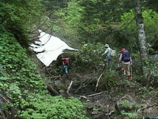 このような登山道を歩いていきます。途中、少し崖崩れのあったような狭いところもありロープにつかまって歩くところもあるのであしもとは確かなものを履いていかなければなりません。沢を渡るコースとは別に山道だけを行くコースもあるということでした。 |