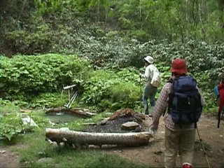 途中、沢を渡ること4回!沢は雪解けの増水のせいもありけっこう深くて流れも早かったので、雪国にすむ私は雪片づけ用の膝までくる長靴を履いていったがそれでもぎりぎりであった。4回目の沢を渡ると、もうすぐ安比温泉に到着。昔、温泉宿があってその湯船だけが残っているとのこと。湯船には山肌の方から筒で少し硫黄の香りのする源泉が注がれている。