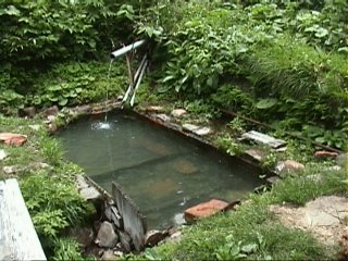 木の枠で囲まれた湯船!手前のすみからから湯が流れ出している。 温度は少し熱めで長くはいっていられない。 中もそれほどごみがあるわけではない(私の基準)ので、とても気持ちのよい入湯だった。 秋にでも、もう一度訪れたい一湯だ! |