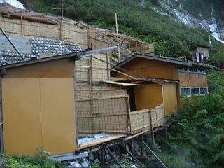 鑓温泉の露天風呂! 男女をよしずの壁で仕切ってある! お昼は ちょいと透けて見えるけど、それもご愛敬。 女性にとっては、景色のいい露天ができたのでうれしいかも! これまでは女性用は四方を壁で囲まれた湯だけだった! 夜は消灯後は真っ暗なのでヘッドランプ等を持っての入浴!真っ暗な中空を見上げると満天の星が見えるはずだが、このときは残念ながら曇っていた。 御来光も朝4時におきて、露天風呂でスタンバッっていたのだが見られず(涙)。 |