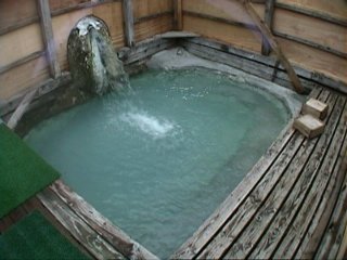 露天風呂(男性側!) とにかく山にへばりつくようにたてられている鑓温泉なので、見晴らしがいい。 お湯は少し白濁した 熱めの湯。 昼に入ったので、小さな虫にあちこち刺されて ひどい目にあった。 夜ならOK! 湯桶は木で作った手作りらしきもの。これがまたすごく重くて・・・ |